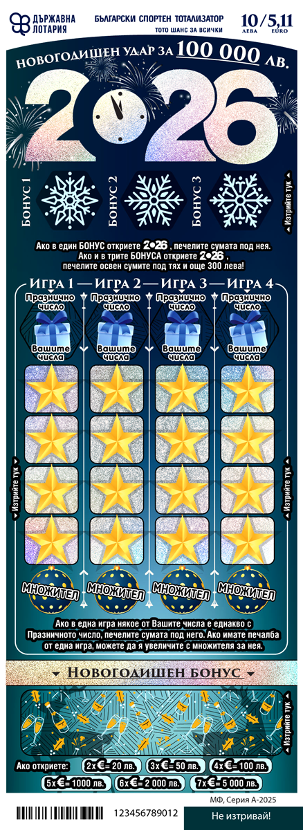 - В игрална зона „НОВОГОДИШЕН БОНУС“, след изтриване на покритието на полето на зоната се открият: