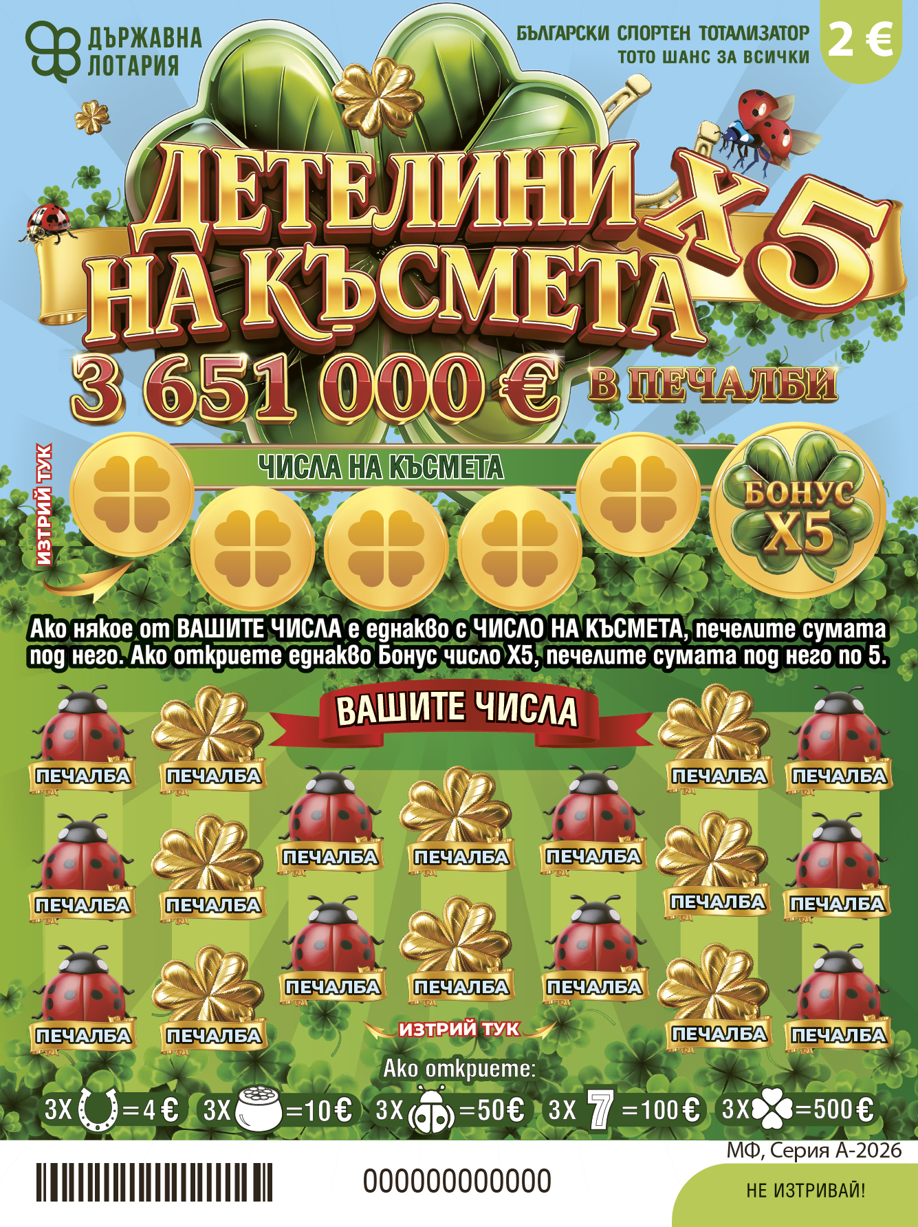 - Печалба от игрални зони „ЧИСЛА НА КЪСМЕТА“ и „ВАШИТЕ ЧИСЛА“ се дължи ако след изтривате на покритието на полетата на зоните, в някое от осемнадесетте полета „ВАШИТЕ ЧИСЛА“ се открие число, което е еднакво с число, изписано в някое от петте полета „ЧИСЛА НА КЪСМЕТА“ - в този случай, печалбата е сумата в евро, изписана под еднаквото число, разположено в поле „ВАШИТЕ ЧИСЛА“;