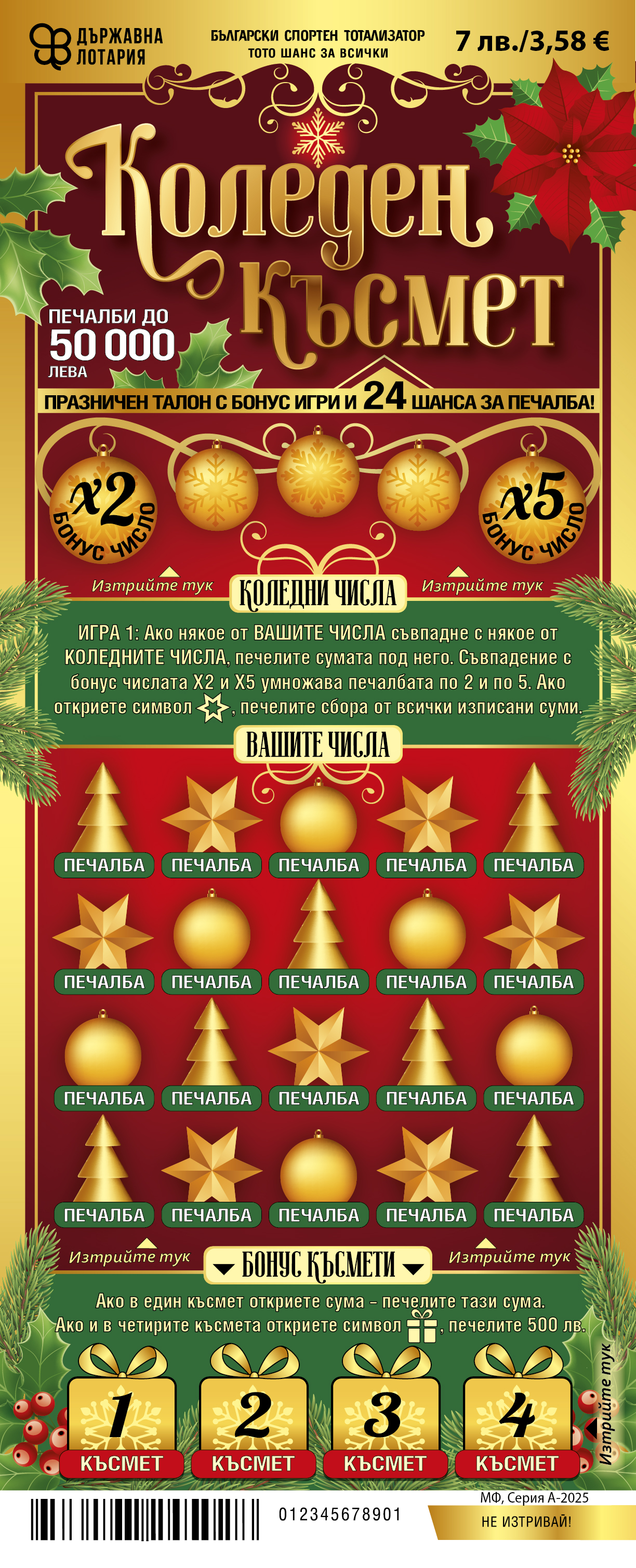 след изтриване на покритието на полетата „КОЛЕДНИ ЧИСЛА“ и полетата „ВАШИТЕ ЧИСЛА“, в някое от двадесетте полета „ВАШИТЕ ЧИСЛА“ се открие число, което е еднакво с число, изписано в някое от трите полета „КОЛЕДНИ ЧИСЛА“ - в този случай, печалбата е сумата, изписана под еднаквото число, разположено в поле „ВАШИТЕ ЧИСЛА“;