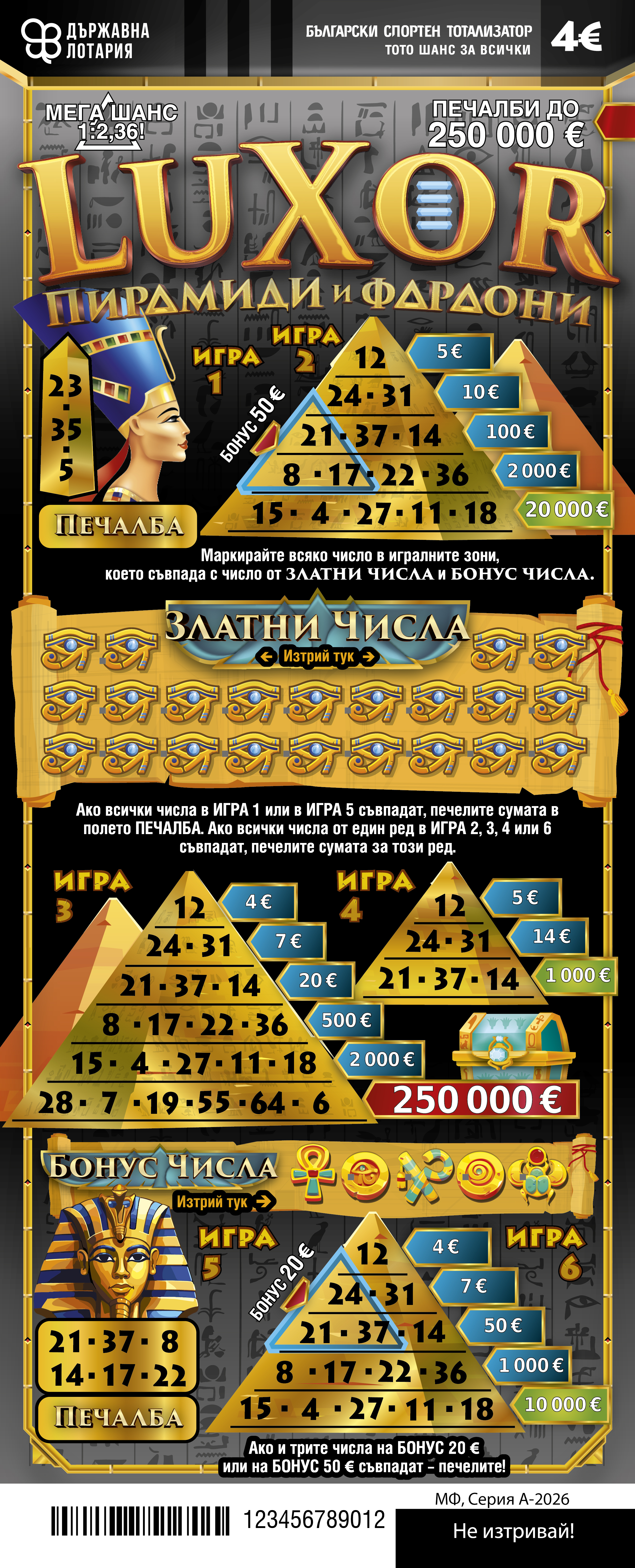Талон от моментната лотарийна игра „LUXOR - Пирамиди и фараони“ (четвърти тираж) на Държавна лотария е печеливш, ако в зона: