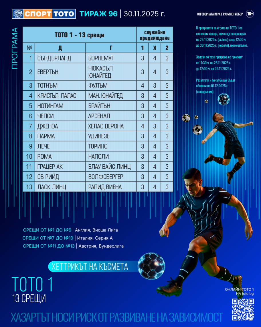 Залози за трите игри в програмата на тираж №96 в “Спорт тото 1” ще се приемат до 12:00 ч. на 29.11.2025 г.